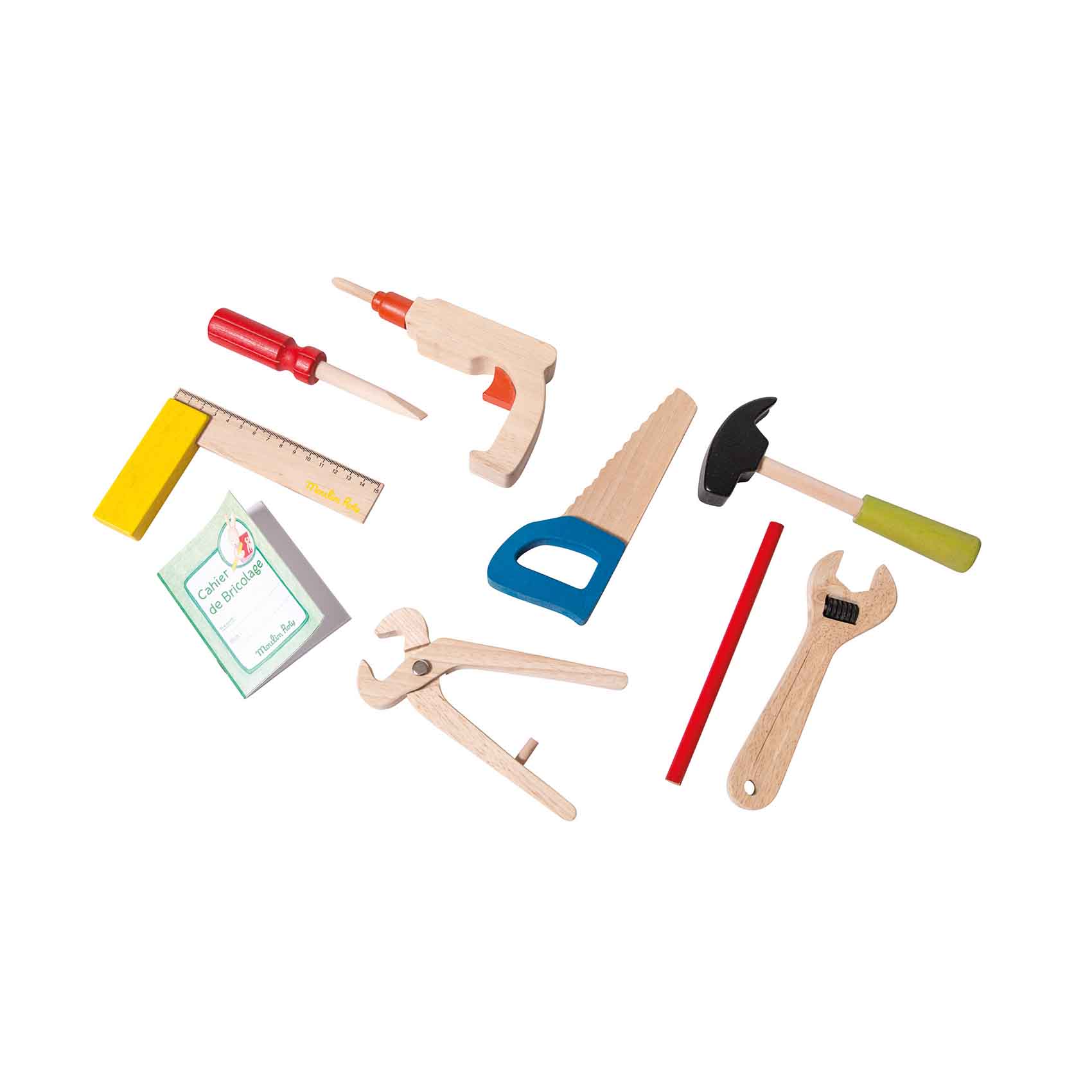 1 lápiz y 7 herramientas de madera, formas redondas y coloridas, ¡fácil de agarrar con las manitas! Todo está perfectamente guardado mediante correas de velcro y pestillos en una preciosa maleta de madera ilustrada: ¡Para llevar a todas partes!. Mide 20.5 x 16 cm.
