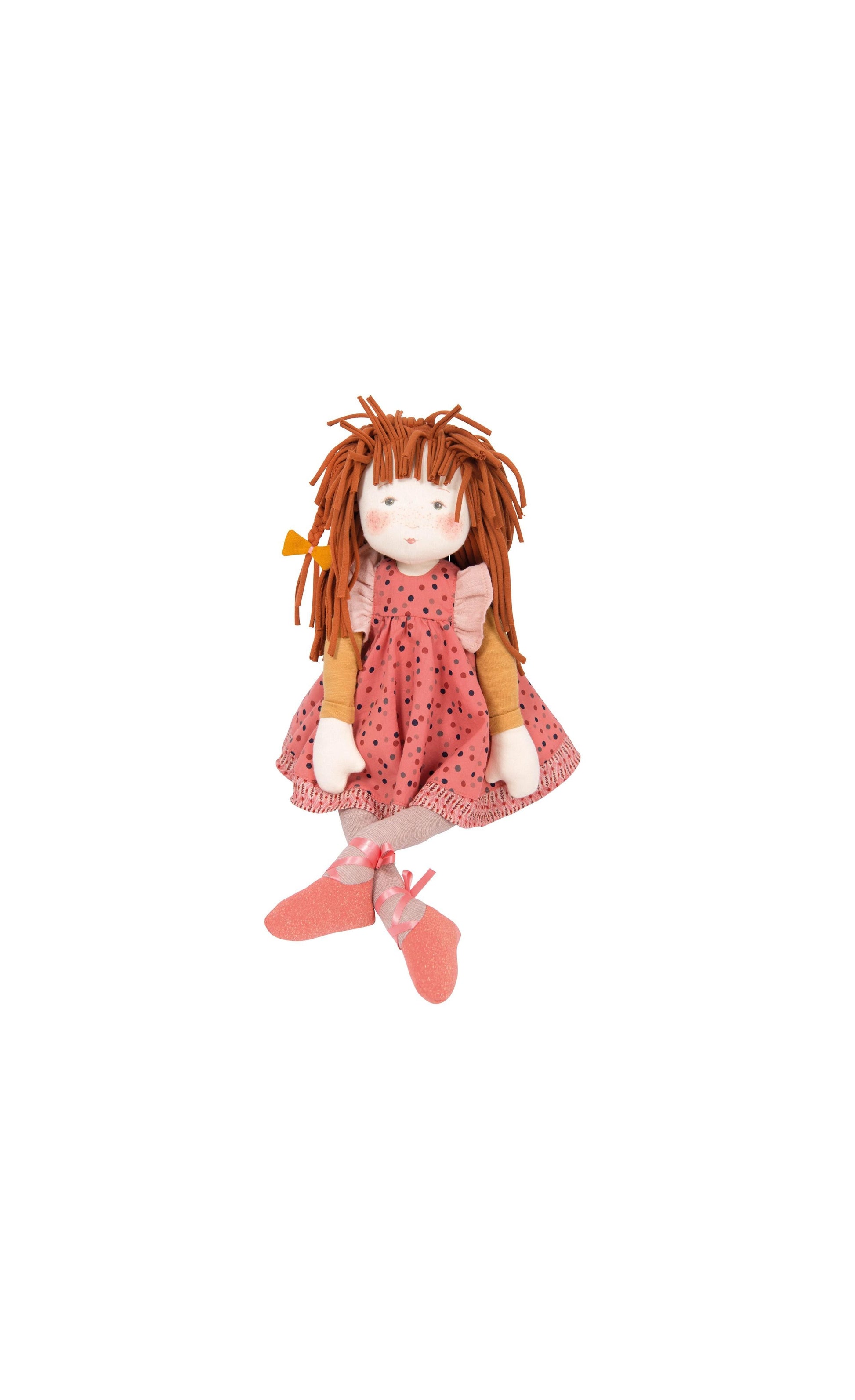 Muñeca de trapo,con una hermosa cara ilustrada, pelo rojo largo.