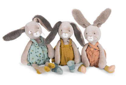 Hop, Hop, Hop, Tres conejitos saltan al fondo del jardín. Dos rábanos, una bonita zanahoria… ¡Es hora de disfrutar! Una colección con materiales suaves para acoger al bebé con ternura.
